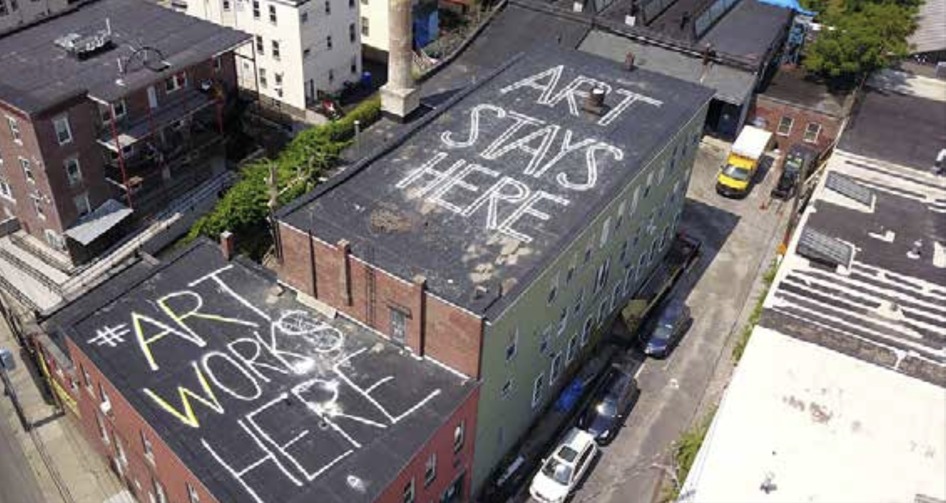 The rooftop of Humphreys Street Studios displaying its #ARTWORKSHERE hashtag that extended its campaign to the skies.
