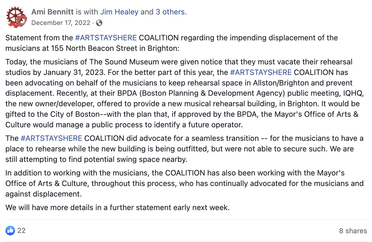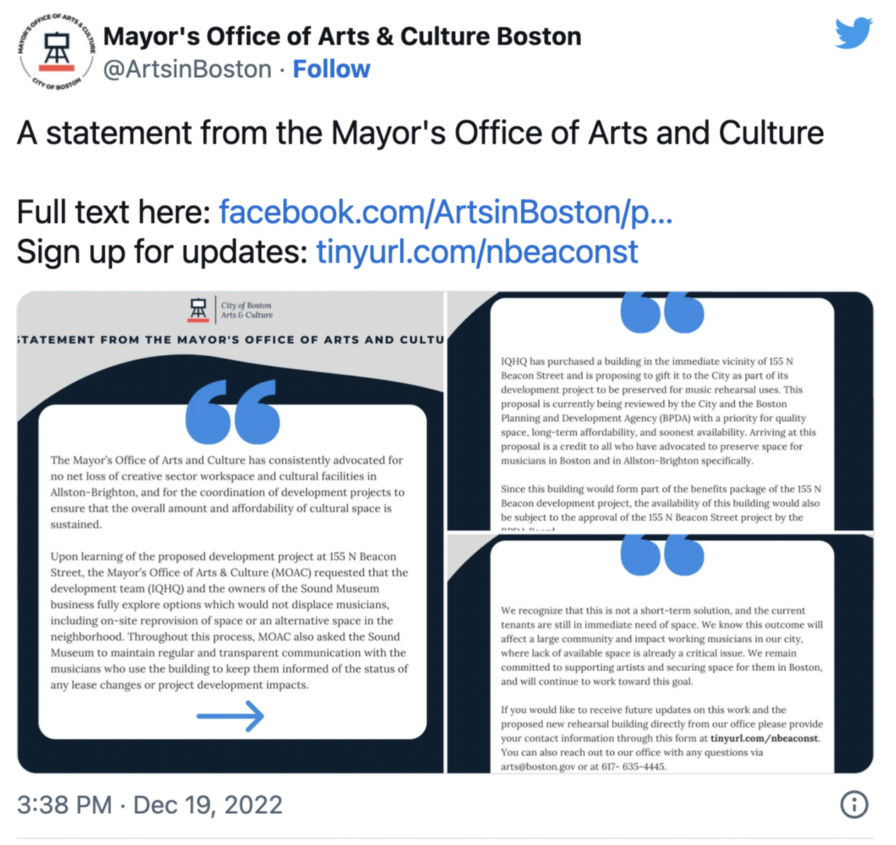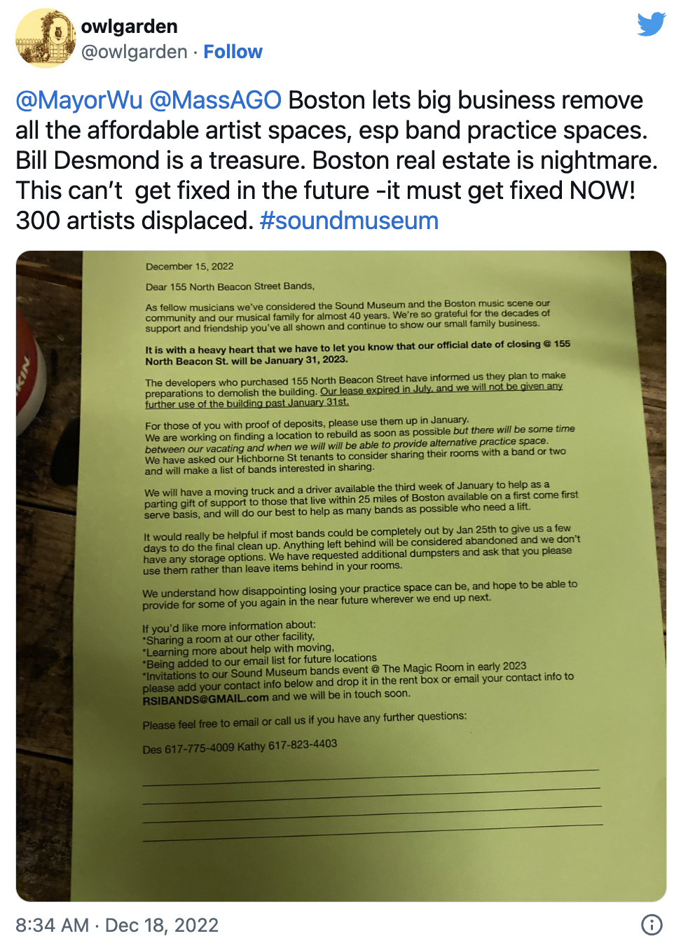 On Monday (December 19), the Mayor’s Office of Arts and Culture released its own statement, which reads in part: “The Mayor’s Office of Arts and Culture has consistently advocated for no net loss of creative sector workspace and cultural facilities in Allston-Brighton, and for the coordination of development projects to ensure that the overall amount and affordability of cultural space is sustained. …Mayor’s Office of Arts & Culture (MOAC) requested that the development team (IQHQ) and the owners of the Sound Museum business fully explore options which would not displace musicians, including on-site reprovision of space or an alternative space in the neighborhood.”